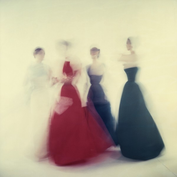 unpublished / killed, blurred ethereal shot of four models in party dresses, ball gowns, Clifford Coffin’s last sitting for British Vogue