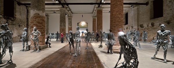 其他藝術家的作品則散布在展場的各個區塊,如在大堂的一區,充斥著波蘭藝術家Pawel Althamer 的人型雕塑,這些灰白色看似聖潔卻又讓人毛骨悚然的塑像,彷彿引領人們回到古老威尼斯的某個時空,但是又超現實地讓人意識到當下,甚至未來世界的存在。而美國藝術家Matt Mullican則用無盡繪畫的方式測試人們對美的感知。走進Matt Mullican 利用紙張搭建出來的空間中,像是走進藝術家的實驗室,其利用符號、數字與圖形與觀者對話,同時使用世界通用與因文化差異而個別認知不同語言。