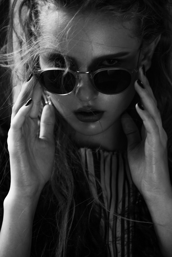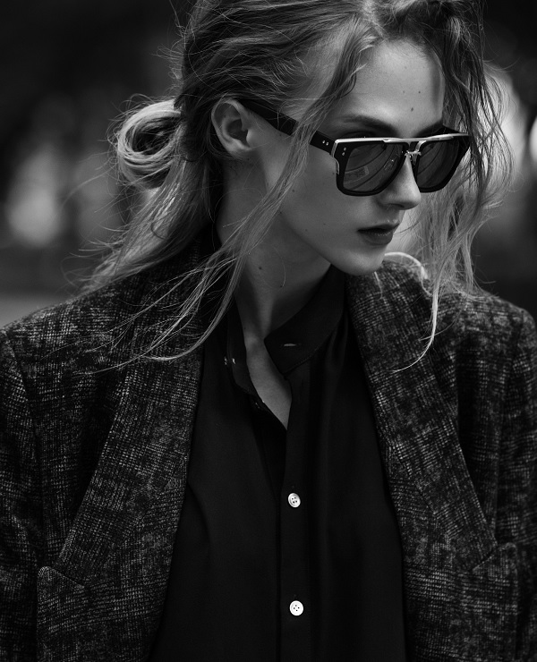 【黑色金屬墨鏡by DITA;深灰混色外套、黑色雪紡長襯衫all by Michael Kors】