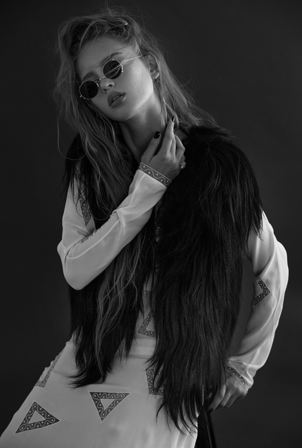 【銀框圓形墨鏡by 井戶多美男;白色洋裝by Chloé;黑色皮草背心by Michael Kors;鑲鑽放射造型戒指by SWAROVSKI 】