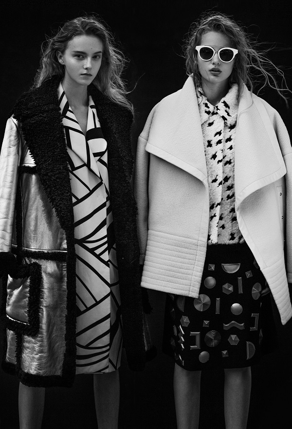 【(左) 黑白混色羊毛大衣by Bottega Veneta;拼接毛料金色皮革外套 by PRADA。(右) 白框圓形墨鏡by DITA;米色翻領外套、千鳥格紋毛外套、金屬裝飾膝上裙all by Chloé 】