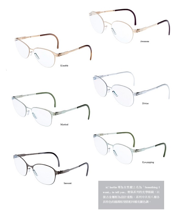 向來熱衷於跨界合作的ic! berlin,此次也邀請同樣來自柏林的時尚設計師Sarah Hartbo及Paula Immich,為「Something I want… to tell you」輕氧系列操刀設計。為了打造能讓女性視為珠寶般收藏的眼鏡作品,Sarah Hartbo及Paula Immich從50、60年代汲取靈感,著眼於經典美學與現代女性魅力的集合,設計出「Awesome」、「Kissable」、「Divine」、「Lightly」、「Eye-popping」、「Mystical」、「Innocent」、「Playful」共八種鏡片形狀不同的鏡框,兼具經典、美麗而優雅的氣質。雖說是為女性設計的系列,不過ic! berlin也沒忘了廣大的男性顧客,其中包含「Awesome」等三款眼鏡就定調為男女皆適戴的中性款式。
