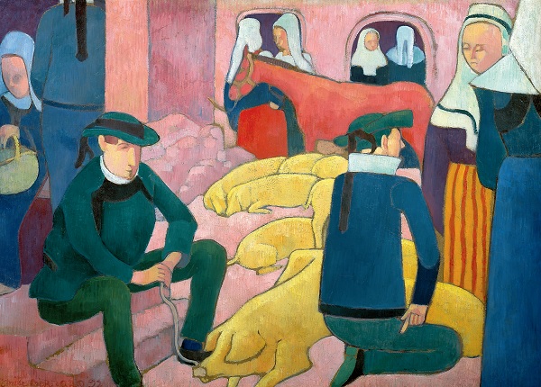 《販豬市集》(Le marché aux cochon)則使用了對比強烈的鮮明色彩,反映出當時另一種畫派—納比派(Les Nabis)所提倡的「反映當下生活的內在、精神和夢」之主張,大量的粉紅、金黃、葡萄紫,點綴著幾處紅色與湖水綠,用獨樹一格的奇幻色調來詮釋養豬農家 。