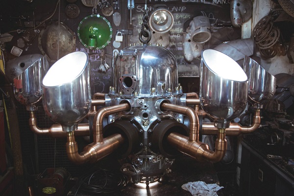 鍋爐的蒸氣混雜著機油與鐵鏽的氣味,金屬敲打與機械運轉的規律節奏,儼然成了早期工業時代交響樂的代表作。英國設計師Paul Firbank 與合作夥伴Lizzie Gossling,以自創燈飾家俱品牌 THE RAG AND BONEMAN,向這鑄型當代光景的年代致敬。