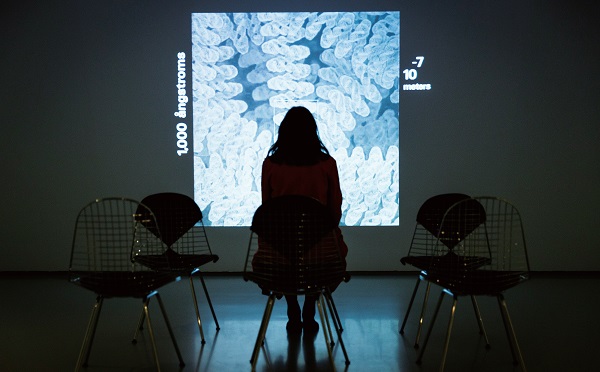 從入口開始,『Parts』展區有系統 地介紹一系列 Eames 創作的工具, 緊接著兩個主展廳呈現大型機鼻裝置 與小型兒童家具,包括經典大象椅和 小圓桌。還有一系列的 Eames House 手繪稿、兩人來往書信,以及建築歷 史學家 Reyner Banham 拍攝的影片, 紀錄兩人位於洛杉磯的故居。此區 也包含影像創作『Tanks』,展場模 擬 Eames 家的客廳,讓參觀者能透過 影像身歷其境感受兩人對海洋生物保育的重視。此外,巴比肯藝術中心也 和 John Morgan Studio 合作策劃一系 列文字與影像幻燈片,展示 Eames 夫 婦的家庭生活、研究和創作計劃手稿與論述;以及與 Eames Office 合作挑 選出的一系列 Eames 常使用的織品圖 騰,和玻璃纖維椅的等比模型等。