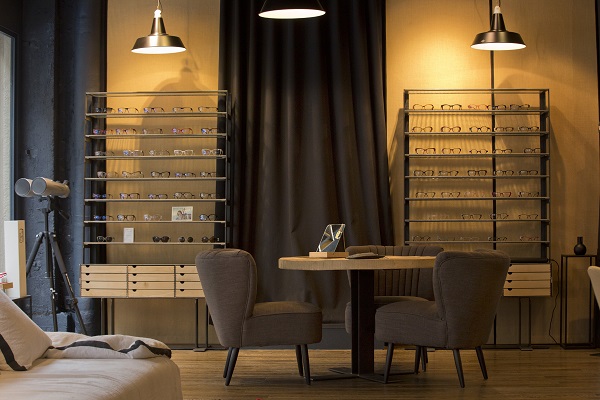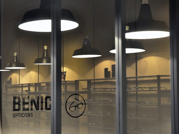 Benic Opticiens 店面外觀由諾大 玻璃窗與黑色邊框相間而成,搭配店 內深色木質櫃台以及倚著牆面的鐵 製展示架,透露出些許的工業化風 格,不過再往裡頭探究,可以看到寬 敞的空間裡擺放著提供顧客休憩的 舒適沙發,加上帶有年代感的擺設 物、暖色系燈光與彩色地毯織物,皆 讓整體氣氛轉為活潑親切,也讓走 進 Benic Opticiens 的顧客能立即感 受到居家般的溫暖氛圍。