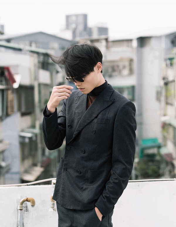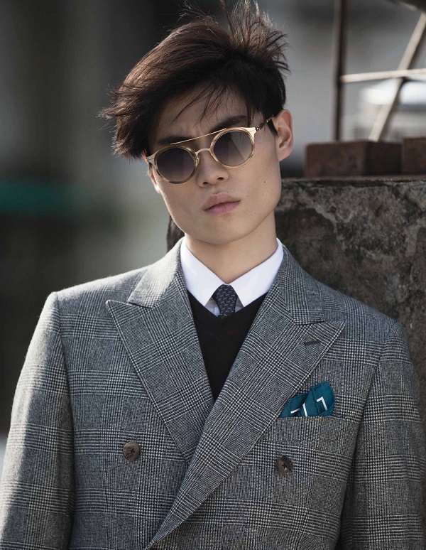 雙排釦西裝外套 by BOTTEGA VENETA;高領上衣 by CHIN MENSWEAR;西裝長褲 by PRADA;金框墨鏡by THOM BROWNE
