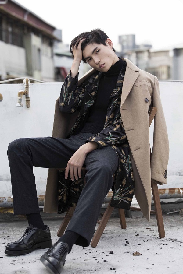 棕色長版外套by PRADA;印花外套CHIN MENSWEAR;高領毛衣by SAINT LAURENT PARIS;西裝長褲by SALVATORE FERRAGAMO;綁帶皮鞋by PRADA