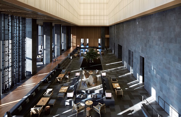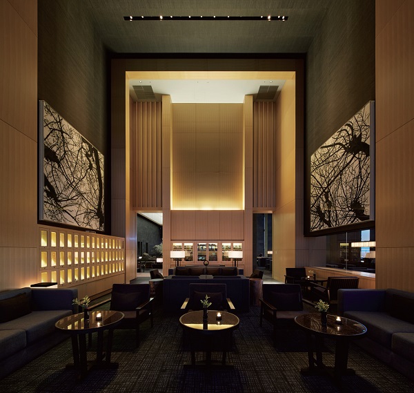 作為六度為Aman集團操刀的著名建築設計師Kerry Hill之作,Aman Tokyo秉持著Aman集團將當地文化融合在建築設計中的品牌精神,透過日式素材如樟木、清水岩、紙及山石,以及日本建築常見的經典元素如和式廊道、走廊地燈的運用,巧妙的在現代建築與科技中蘊藏了日式禪意的寧靜與優美。抵達Aman Tokyo位於33樓的迎客大廳,率先映入眼簾的便是挑高近30米的宏偉屋頂,抬頭仰望更可看到以日式紙燈籠內部構造為靈感的設計,此長40米、寬11米的燈籠型結構是由層層相疊的和紙沿著日式木框延伸,從大廳中心貫穿6個樓層,白天時陽光透過落地玻璃窗與室內空間構成美麗的光影變化,到了夜晚,改由室內燈光與窗外霓虹交織在一起,和諧呈現東京白天與夜晚不同的迷人之處。