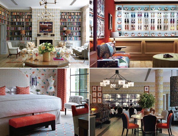 從接待大廳開始,壁面為Kit Kemp 設計的Ric Rac 布料壁紙,獨特的鐘在牆上投射出美麗的圖騰,繽紛的氣息渲染每一位進駐的房客。不同於一般飯店,除交誼廳外,還設有圖書室,以傳統英式風格的織布地毯搭配優雅的燈具,牆上則掛有Joanna Carrington 的畫作,經策劃的歷史、旅行、烹調等類型的書籍收藏讓人流連往返。另一頭的交誼廳則綴有繡花沙發與Robina Jack 繪製的瓷盤;將兩廳分開是設計者的巧思,除了鼓勵客人多探索旅館,交誼廳與圖書室也像白天與黑夜,各自醞釀著熱鬧與靜謐的氣氛。