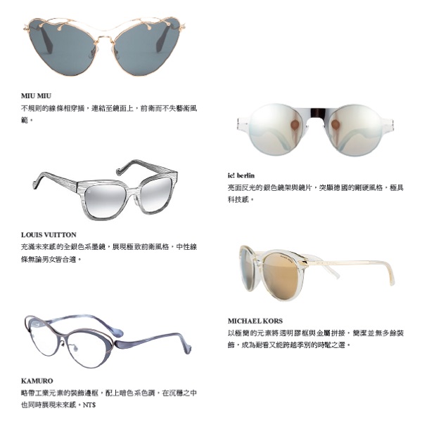 金屬色系、立體金屬裝飾、簡單卻滿溢藝術感的框型,充滿著人類對於未來世界的想像,中性設計的鏡框,潮男型女皆能輕鬆駕馭。