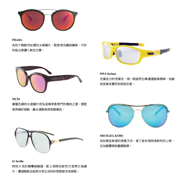 運動休閒風在近幾季崛起後就無限延燒,久久無法消退,水銀鏡片、飽和色系膠框,混搭日常實用的鏡框設計,在這個夏季衝上潮流前線,深受大眾喜愛。