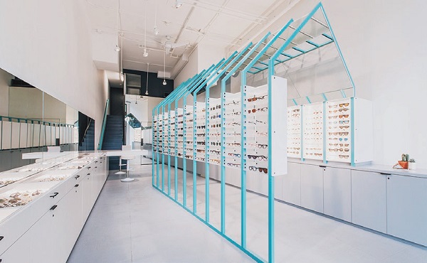 EYE EYE 店內最引人注目的,莫過於聳立於中央的整排支架列,打造出猶如藝廊的走道,透過特別訂製的三角幾何造型讓整體空間更顯活潑,並以清新的藍綠色為純白室內增添上色彩,同時展示著EYE EYE 所販售的高端眼鏡,給予顧客和善的選購環境,而四周林立的多面鏡子,也讓顧客能從多個角度試戴他們心儀的眼鏡產品。