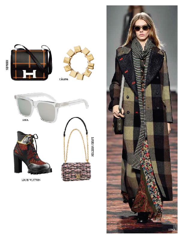 身為時尚圈珍愛的經典之一,格紋元素一向給人安心並穩重的第一印象,並與秋天季節的大地之氣格外合搭,今年秋冬季節各品牌也大量運用此元素。一向主打藝術圖騰的ETRO,在今季則讓模特兒穿上格紋大衣,在摩登都會的風情中混合著無比清新、活力的藝術氣息,多變化而實用性極強,適用於日間的流行都會穿著。LOUIS VUITTON 早秋系列則以打造完整的衣櫃為設計靈感,將精細微妙的細節點綴在每個單品上,利用多層次的設計與異材質搭配,讓包款與鞋款都更具耐看的特質。英倫品牌BURBERRY 當然也少不了經典格紋的演繹,運用在剪裁合身的長大衣,讓平易近人的經典更有時髦氣勢。