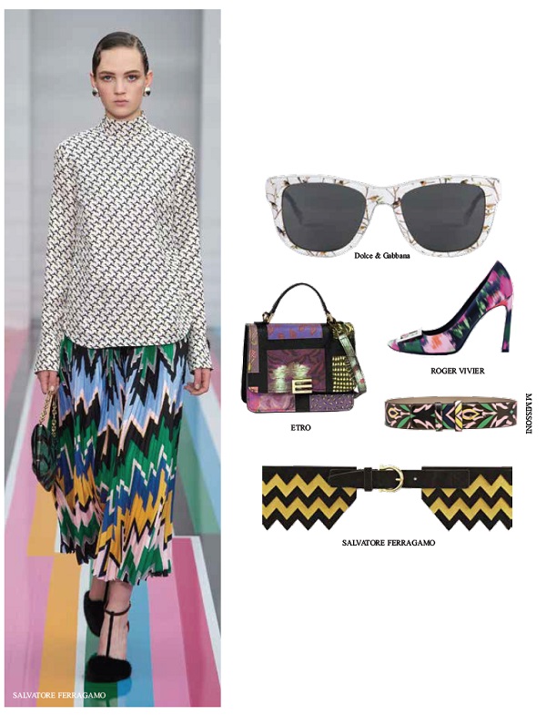 圖騰的翻玩一直是令人樂此不疲的花樣遊戲,高調卻又不失奇想空間,讓一線品牌的設計師們因此不煩膩。SALVATORE FERRAGAMO 的新系列呈現了一幅由充滿趣味性的拼布與優雅的對比穿插織就的精美畫卷,鋸齒形圖案運用於種種不同的形式之中,勾勒出充滿貴族氣質卻又特立獨行的女性剪影。M MISSONI 2016 早秋系列,靈感源自於美國1960 年代自由自在活力奔放的熱情,色彩熱情嬌豔,驚喜不斷,人字形圖案與撞色色塊拼接,美妙吸睛,網狀織紋創造出仿針孔效果;嵌花圖案的緹花布料加入高科技幾何圖案,形象清新。