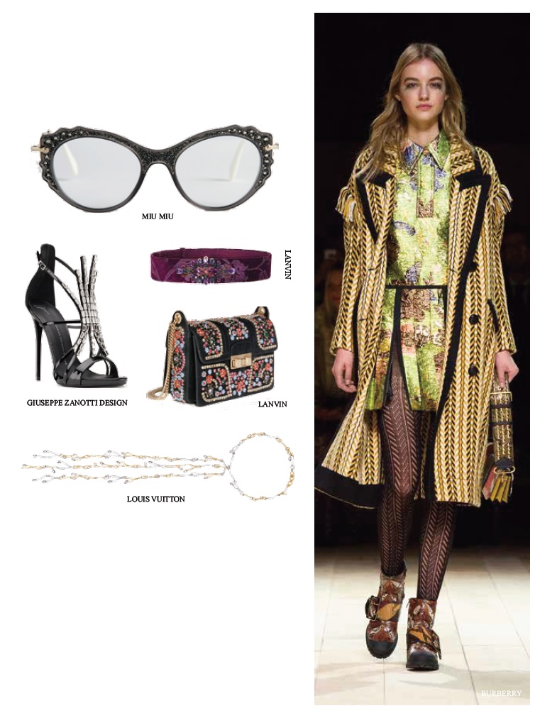 金屬光、BlingBling 材質、亮片等元素,在本季佔有十足的份量,無非要成為眾所矚目的焦點。BURBERRY 在本季大量運用華麗亮片,結合中性風格的軍裝大衣,兼具經典傳承與創新的精神。LANVIN 則鍾情於流暢輪廓和感觀盛宴,洋溢著豐富的色彩元素。五光十色的水波紋緹花或花朵織錦元素,呈褶皺效果的垂墜天鵝絨布料或是閃亮的燒花緞布效果,設計師將多種色彩和面料元素加以揉合,呈現出這一季充滿活力的作品。義大利鞋王Giuseppe Zanotti Design 以Lights On 為主題,極具品牌代表性的水鑽裝飾高跟涼鞋於今年秋冬再次華麗登場:長方形水鑽排列組合成宛如夜店焦點般所投射出的閃耀光芒,搭配上簡約漆亮皮革線條,彷彿將工藝精緻的珠寶飾品裝飾於腳背上。