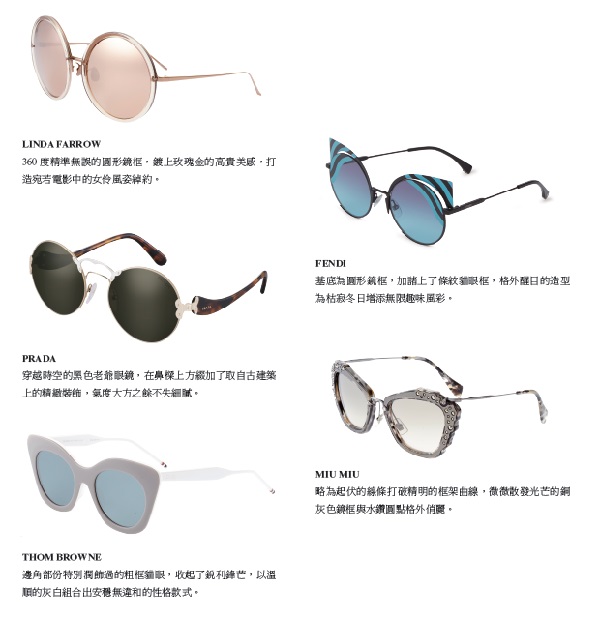 無論是碩大的圓型墨鏡,還是電眼勾人的貓眼款式,或許造型上有些許誇張,卻是想趕上本季的復古潮流的你,絕不能錯過的完美配備。