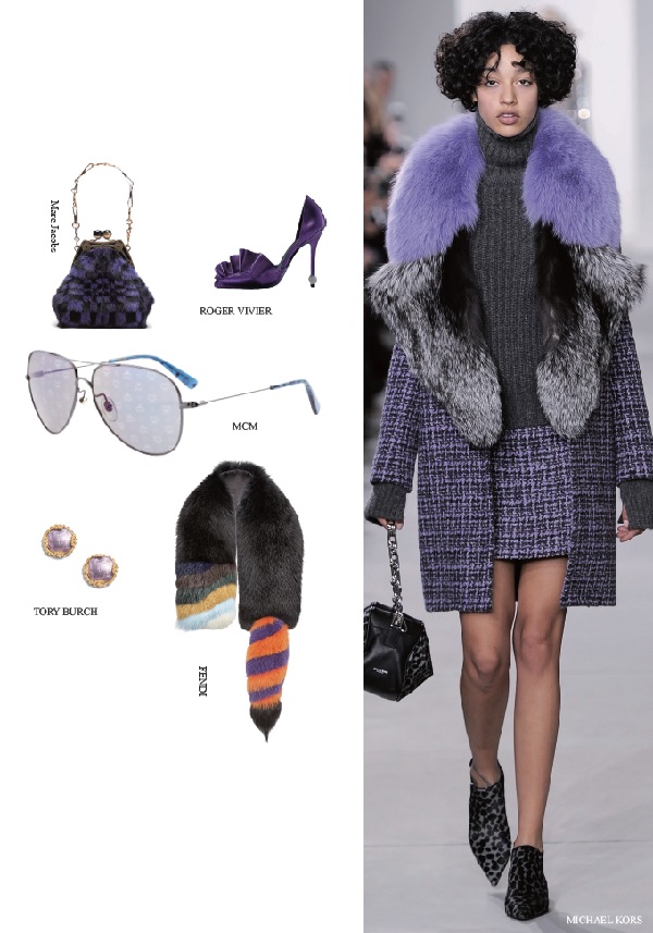 過去一到了秋冬,所有櫥窗裡的服飾都自動彩度降低,以黑、白、灰為主,然而不同於以往,這一季的流行色彩以鮮豔的紫色最為代表性。主張自由隨性移動的俏皮感以及個人別緻的時尚風格,MICHAEL KORS 本次使用了斜紋軟呢織紋、羽毛等素材呈現摩登俏麗概念,亮麗的紫色做為主軸色彩之一,大展年輕活潑氣息;至於被譽為法國鞋王的ROGER VIVIER,最新系列命名做「Armed with Softness」,融和創新與古典造型、剛毅與女性柔美特質,打造出一雙雙浪漫自信的珍逸鞋履,例如亮紫色皮革摺邊系跟鞋款,在鞋跟位置輕輕點綴一圈圓形水鑽,表現優雅與個性的迷人魅力。