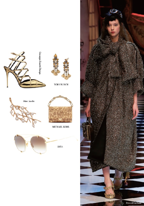 一進入冬季等同宣告著接連而來的歡樂佳節,滿溢著夢幻綺麗的幸福時分,自然少不了閃耀驚豔的亮面服裝。2016 冬季Dolce&Gabbana 以童話公主為靈感,將故事場景拉至現代,截取仙履奇緣、白雪公主、愛麗絲夢遊仙境等童話中的經典元素,明喻、暗示的雙重手法交錯進行,特別是一襲光芒四射的蝴蝶結金蔥大衣,恍若故事中的公主穿越時空不經意地周遊落入了現實世界。而以LIGHTS ON 為主題,靈感取自巴黎Le Palace 及紐約Danceteria 夜店殿堂的Giuseppe Zanotti Design 冬季系列,高超鑲嵌工藝的水鑽高跟鞋、細緻精巧的線條飾帶勾勒出女性的性感足部曲線,形塑奢耀十足的動人韻味,一展由內而外的頂級奢華時尚品味。