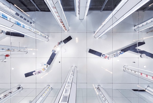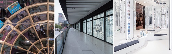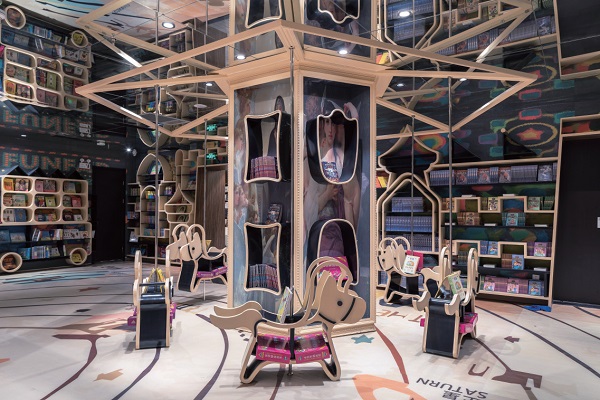 穿越佈滿文字的玻璃帷幕,進到書店,便踏入一道純白空間,豎立的圓柱形書櫃如森林般,沉寂了訪客的心情。進到書店主廳,著名的環形閱讀大廳一層一層環繞包覆,階梯式書櫃提供或坐或站的空間,在鏡面式天花映照下,彷彿置身書籍迷宮中,陷入閱讀的漩渦無法自拔。再往前進,超過65 坪的童書區打造成遊樂場,旋轉木馬、海盜船、雲霄飛車等,在空間中堆塑出兒童樂園的歡樂氣氛,從空間開始吸引兒童的心神,特製的書架讓書籍成為遊樂園的內裏,讓閱讀與玩耍並進,甚至合而為一。