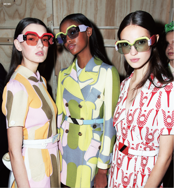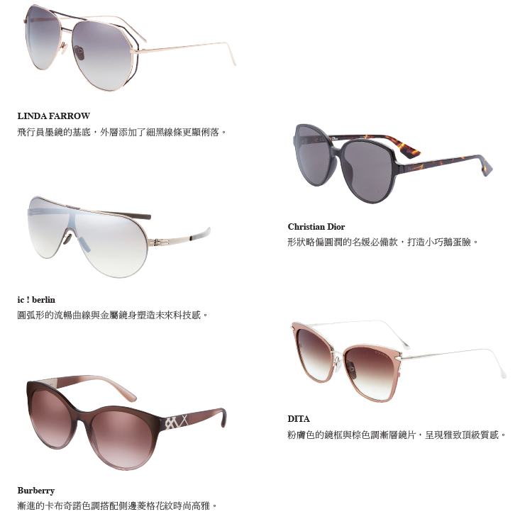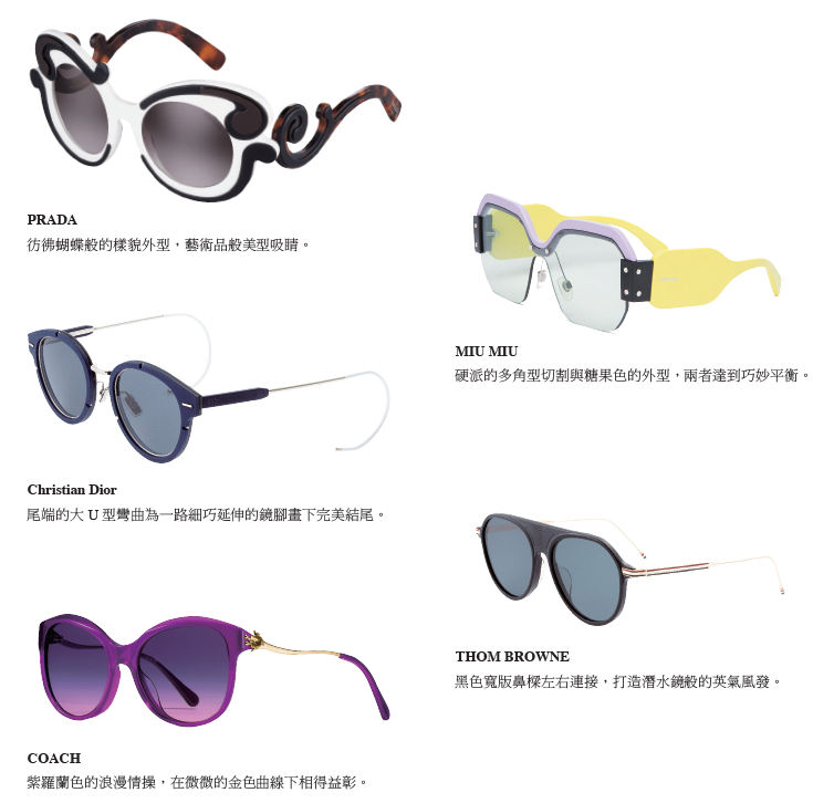 頗具包覆效果的大框眼鏡向來是相當受歡迎的款式, 幾乎佔去臉部一半的面積在臉型的修飾上效果極佳,依 然是春夏的新寵。
