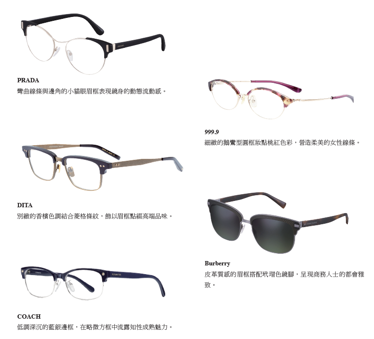 簡潔的都會型流線,小巧別緻的金屬邊框上配飾造型 眉框,用理性的穩重外表感觀一切,型塑專業自信的風 格形象。