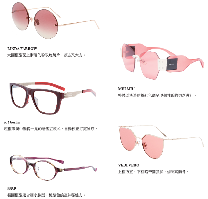 紅粉色系是 2017 年春季的眼鏡流行指標,特別的是 今年不走甜美優雅路線,個性風的造型表現在框型的俐 落感及大鏡面之處。