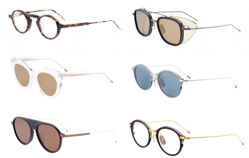 將美國四十至六十年代的建築師、藝術家、工程師及學者等人物視為謬思,Thom Browne 眼鏡系列完整呈 現美國精神中的自信風采,全系列商品皆在鏡腳處焊上代表 Thom Browne 的紅白藍線條,為品牌的專屬標誌; 以頂級鈦金屬打造的金屬框架,鏡腳末端可配合配戴者的耳型自由彎曲,充分表現設計上的流線之美;另有 上等醋酸纖維製成的鏡架,則以大膽配色注入 Thom Browne 最為人樂道的前衛創意;此外,從工業用焊工護 目鏡上獲得的靈感,順勢成為眼鏡上的網面及皮製護罩邊飾,融合著復古元素與摩登造型,是 Thom Browne 數一數二的經典作品,其既衝突卻融洽的視覺效果,也正是 Thom Browne 的特色與精神所在。