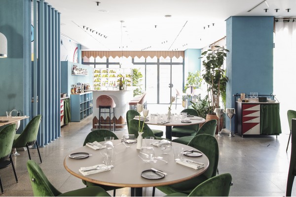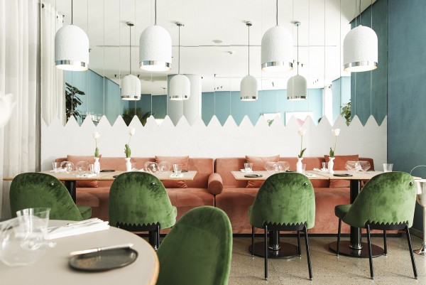 藍色是Kaléo 的主色系,鮮明的磨石藍帶有地中海的暖意,交互搭配了淺粉色與蕨綠色的高腳椅,與吧台後方的繽紛掛毯相互輝映,提升整體空間的溫度與彩度。帶有暖意的活潑、帶有厚度的繽紛,就是Kaléo的空間主視覺。磨石子牆面堆砌的吧台,配上粉色高腳椅;蕨綠則配上天鵝絨材質成為餐椅,圍成一圓桌的親密;三角鋸齒狀圖騰遍佈吧台、鏡子、椅子上,粉紅大理石矮桌配上舒適的綠沙發椅;紅白抽屜訴說著櫥櫃的個性,精心搭配的天鵝絨遮擋閃耀著,發光處展現著撫觸後溫暖的痕跡。