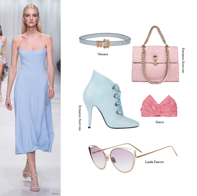 粉粉嫩嫩的馬卡龍色系鋪滿了這一季的時尚圈,想像春天綻開的櫻花、療癒紓心的薰衣草田、酸甜滋味的檸檬雪酪又或者清新沁涼的蘇打汽水,全部化作一件件溫柔霓裳,少了過多複雜的細節設計,回歸關注衣服的單純樣貌,感受浪漫可愛的風味造型。例如Versace推出的粉藍色挖胸洋裝,一展天真純淨的無瑕美感;另外Ermanno Scervinno 在本季亦有不少精采的馬卡龍系單品,像是淺粉紅色的皮革包款混搭玫瑰金色鍊條,浮現小女人的從容優雅,墨鏡方面當然也少不了新款的Linda Farrow 漸層款式,不合邊的特殊金屬外框特別有趣,戴上度假般的愉快好心情。∞
