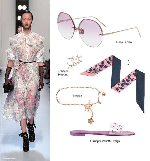 延續今年春季流行,露出肌膚的透視風服裝為夏季帶來一絲清爽仙氣,選擇白、粉、天空藍等色製造飄逸浪漫感,而黑、綠樣式則在個性之中帶點小性感,在透膚的及膝長洋裝與風衣上裝飾如荷葉邊、蕾絲、亮片等巧緻細節,整體流露成熟嬌媚。Ermanno Scervino 這一季以此為主題,推出透膚小碎花洋裝、粉彩蕾絲裙,甚至連西裝外套都加入透視元素;臉上不妨以Linda Farrow 最新系列墨鏡完成妝點,多角復古框型以金色包邊凸顯上流高貴,搭配鏡面的淡粉色漸層設計展露度假風情。
