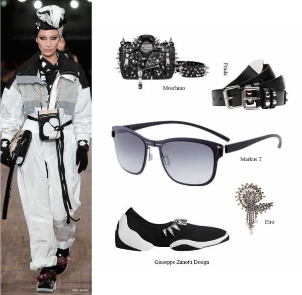 靈感出自機能性的派克大衣與登山服,這一季可以看到各家品牌以高級細緻的手法重新詮釋並推出不同種類的防風服飾,例如Marc Jacobs 一身白灰連身褲裝,落肩的寬鬆造型與細節抽繩設計,混搭內裡正裝高領衫,巧妙完成機動性與時裝的新鮮組合;而腳上則可以搭配Giuseppe Zanotti Design 的運動休閒鞋款,包覆貼合腳身的面料材質與氣墊設計減低雙足壓力,前緣的寶石鑲嵌低調奢華;最後搭配個性十足的Markus T 漸層方框墨鏡,盡展現代女性的帥氣風範。.