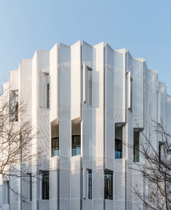 前身為售樓中心的八分園,由業主謝先生委託建築設計師俞挺及其團隊Wutopia Lab操刀,原先建造目的僅為私人住宅及會所之用,在俞挺發現謝先生為久新搪瓷廠的最後一任廠長時,反覆溝通下演變為對外開放的展覽空間,甚至發展成結合多重用途的微型文化綜合體—一樓美術館用來展示謝先生長年收藏的大量搪瓷,讓這些珍貴的搪瓷得以重生並面向公眾,同一層樓另有餐廳和書房;二樓為圖書館與咖啡廳;三樓是辦公及臨時展覽場所;四層為民宿;最上方的露天屋頂則精巧的設計為菜園。此外,謝先生之子所創辦的搪瓷品牌也入駐於此,讓傳統工藝的傳承與新生成為八分園的另一深層涵義。掩映在住宅區圍成的三角形地帶,八分園在建築本體之外,另包含一大片讓城市呼吸的綠色園林,體現了大自然與現代建設共生共存的願景。進一步整個觀看園區,可以發現設計團隊巧妙地以黑色格柵隔絕了外頭雜亂的景觀,並利用潔白的多孔鋁製板材包裹著建築表面,打造出摺扇狀的獨特外型,其梅花狀孔洞的設計不僅帶來面紗般的輕盈質感,也讓灑落的陽光穿透入室。而在格柵與建築物的一黑一白對比之間,則是充滿綠意的中式造景園林,設計團隊取材自1970 年代上海街頭公園的風格,並因地制宜的利用園裡原有的朴樹,搭配人造的山石、河流、瀑布等元素,在水泥叢林築起一方足以讓人忘懷的山水,向當地園林歷史致敬,同時也賦予空間更多的情境及想像,可說是中國傳統建築現代化的理想典範。