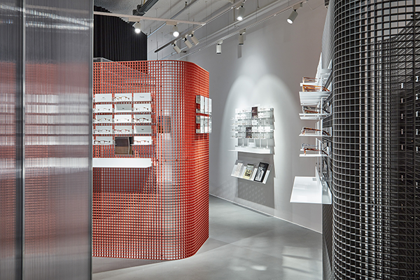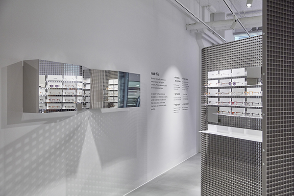 OS & OOS 以Eindhoven 地區摩登的工業風格建築為靈感,並結合「遠視/ 近視」的光學概念,打造趣味十足的迷宮幻象,其用來展示眼鏡的蜿蜒鋼鐵牆,從不同角度觀看便能得到密度不均的視覺成像,頗有進入光學幻覺隧道的錯視感。