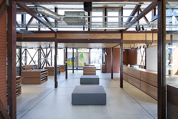 為了給消費者更舒適的購物體驗,JINS 特別委託SchemataArchitects 為其Ageo 旗艦店進行翻新改造工程。原有的 Ageo 店舖由兩個L 形組成,分別為眼鏡店和咖啡館的營業場所,共同圍繞著作為戶外咖啡館空間的方形庭院,然而,原有的建築物被木板覆蓋住,其庭院和咖啡館也淹沒在周圍街區中。為使店舖更貼近消費者,Schemata Architects 拆除了Ageo 店舖原有的外牆、安裝上Low-E 玻璃,以玻璃替代木質外牆,此舉能讓其建築內部及庭院在街道上就能清楚地被看到,並藉以窺見其內部展示的多樣眼鏡產品,而在通透明亮的採光中,店內消費者也能同時欣賞著街道和庭院的景緻,遙相呼應著JINS 為消費者提供更好視野的企業宗旨。