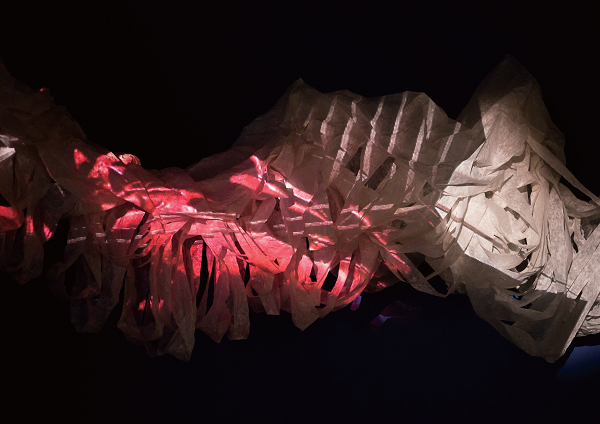 作品「鏡像」(Chiral)中,以三段影像片斷循環投射在平面紙幕與雕塑,透過兩種投影效果(綿紙、紙雕塑)打破觀者的視覺想法,創造出影像創作的另種觀看思維,三段影像在相同介質卻不同形體結構中建構出整個作品的最初體,在流動的影像片斷中,看得出中國書畫潑墨的氣韻,以及過去生物背景所見的有機物形象,結構,然後融成獨立卻又相互協調的視覺經驗。
