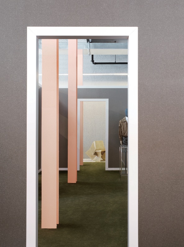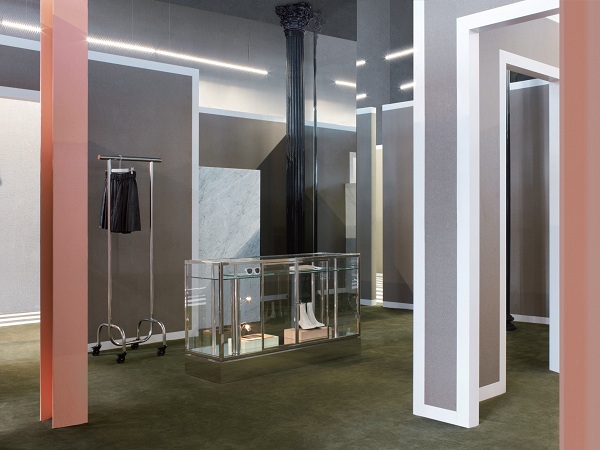 店內風格除了延續斯德哥爾摩總店的設計概念,Jonny Jonansson將瑞典王國十八世紀末Gustavian優雅簡潔的傳統,增添了現代的氣息,用前衛演繹古典的手法,以當時的經典灰、白二色作為室內的主調,灰色牆壁的展示間搭配上白色線條的框線,架上只放置同一色系甚至是一件服飾,彷彿是觀看一幅畫一般, 使得ACNE的設計更跳脫出框架。店內的家具和擺設也都是特別為紐約旗艦店所量身訂製,金屬和玻璃的結合,流露出冷冽工業風格,搭配暖色調的樑柱及俐落的線條,展現出瑞典與生俱來的清澈、低調特性。 除此之外, 店內空間的是以斯德哥爾摩這座被群島環繞的城市作為發想,以黑白直條紋的地磚分割出區塊,座落於正中間的藏綠色地毯作為陸地的延伸,沿著迴廊帶你走進一間間如藝廊的展示區,並放置藍色玻璃面板於落地窗前作為環海的聯想。