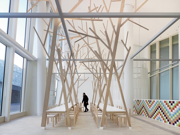 贏得最佳餐廳大獎的是來自於西班牙Estudio Nomada為主的設計團隊。位於西班牙加利西亞的A Cantina。以單純的原色搭配,將原木色調製成枝幹狀的高架,構築於挑高的餐廳空間中,其將樹林的繁複解構,去蕪存菁地把屬於自然的原型拉進人文空間。餐廳的光線取自旁邊的大落地窗與上方線條簡潔的日光燈反射,間接的照明方式,讓用餐環境的光線變得柔和可親。配合房頂的挑高設計,領著走在廊道間的人們,彷彿穿梭在林野之間的感覺。取餐區的彩色磁磚拼貼,巧妙地將色彩帶到單純的原木空間中,讓空間帶著令人愉悅的活潑氣氛。而顏色也出現在物品放置區的木架邊旁,與另一側的彩色磁磚拼貼相互輝映。